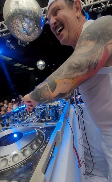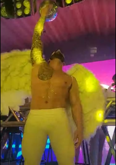 A noite também foi marcada pela presença de dois dançarinos com cabelos fluorescentes, que trouxeram uma nova camada de brilho e energia para o palco. Além disso, os modelos vestidos de anjos voltaram à cena, incentivando os convidados a aproveitar ao máximo o clima de diversão e liberdade. O line-up dos DJs foi outro ponto forte, com performances que mantiveram a pista de dança aquecida e envolvente: